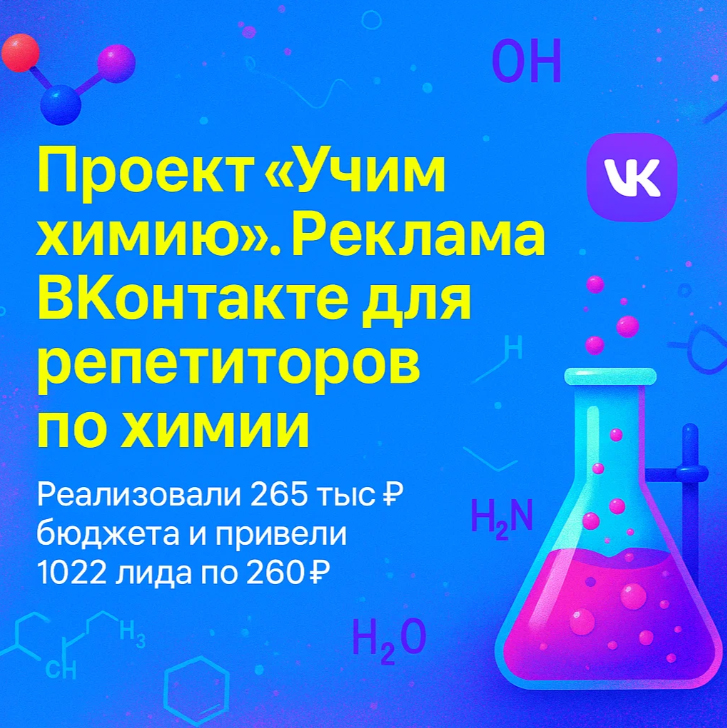 Образовательные проекты нуждаются в точной и продуманной рекламе — особенно, если это не массовые онлайн-курсы, а индивидуальные занятия и небольшие группы. В этом кейсе расскажем, как мы запустили и масштабировали рекламу во ВКонтакте для проекта «Учим химию» — репетиторского направления для школьников и взрослых.
